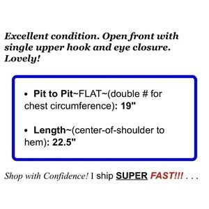 Excellent condition. Open front with single upper hook and eye closure. Lovely!