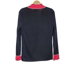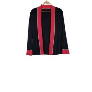 Lovely black textured open front cardigan. Stretchy. Windowpane pattern. Features pink & white accents along the trim. Curly lettuce edge hemming on the sleeves and down the front. Long sleeves.
