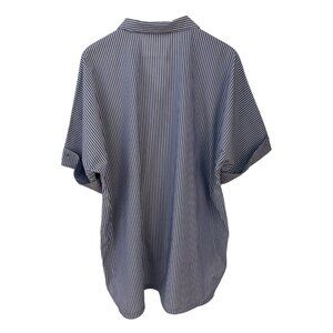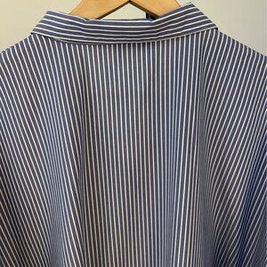Classic Ming Wang blouse featuring a navy blue and white vertical stripe pattern. Designed with a relaxed silhouette and open notch collar. Lightweight cotton-blend fabric with slight stretch for comfort. Perfect for layering or wearing alone for a polished yet casual look.