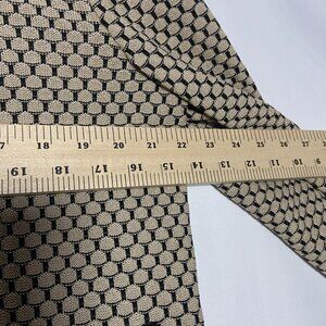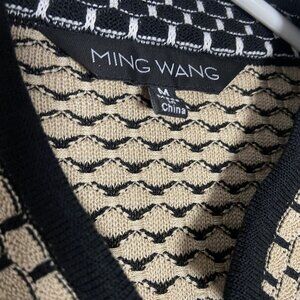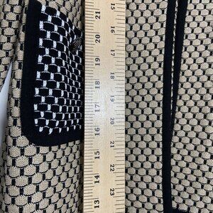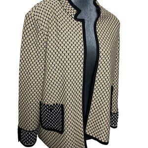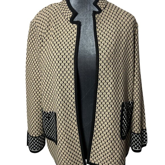 This Ming Wang knit jacket offers a sophisticated look with its beige and black textured pattern. Designed with an open front, it provides a versatile layering option suitable for various professional settings. The black trim enhances the overall aesthetic, adding a touch of elegance.