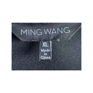 Chic Ming Wang open-front jacket-style top in size XL featuring a front hook-and-eye closure at the neckline, structured shoulder pads, and lime green embroidered trim down the front and sleeves. Black knit body, 3/4 sleeves, and signature Ming Wang tailoring. Great preloved condition with no flaws noted. Perfect elevated piece for career wear, events, or polished everyday looks.