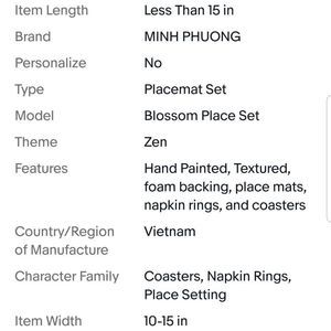 You Will Receive 8 Place mats, 8 Coasters, and 8 Napkin Rings New without tags, in original packaging, but packaging is worn. view all photos as they are apart of description and contain significant information and is exact item you will receive. May be removed at anytime due to Co listing. Thanks for looking.