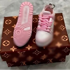 Mini 3D sneaker-style keychain charm. Decorative novelty accessory only. Comes with a left and right sneaker in a miniature box!