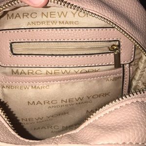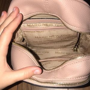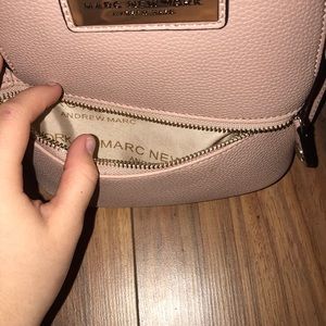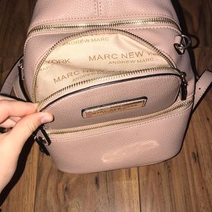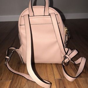 It is light pink with gold accents, it is a mini back pack but it can hold a lot of stuff!