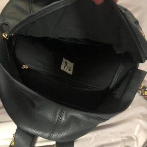 Black mini backpack with embellished designs on the front pocket and straps. Has a large zipper with one inner pocket. Front pocket with clip closing