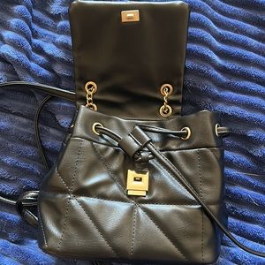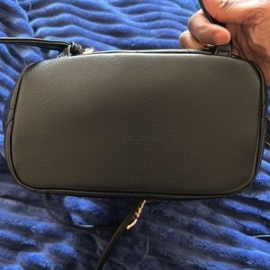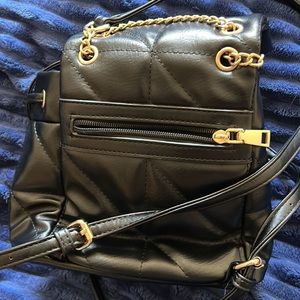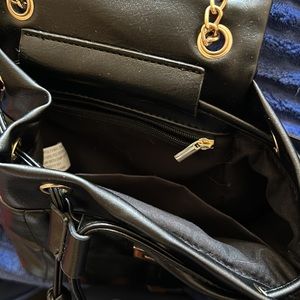 One zip and one open pocket on inside. One zip pocket on outside. Tag doesn’t show the brand so I’m not sure