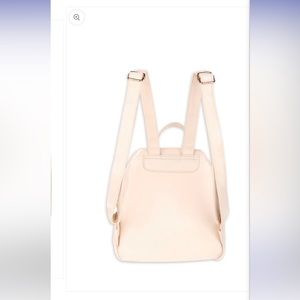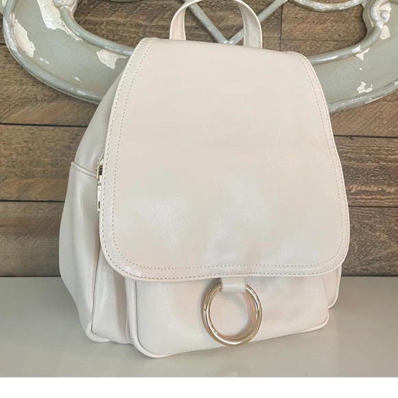 Faux leather cream backpack featuring flap top with magnet closure, double entry zipper compartments, top handle and adjustable shoulder straps.