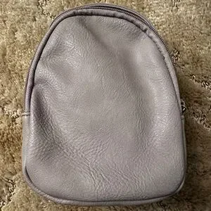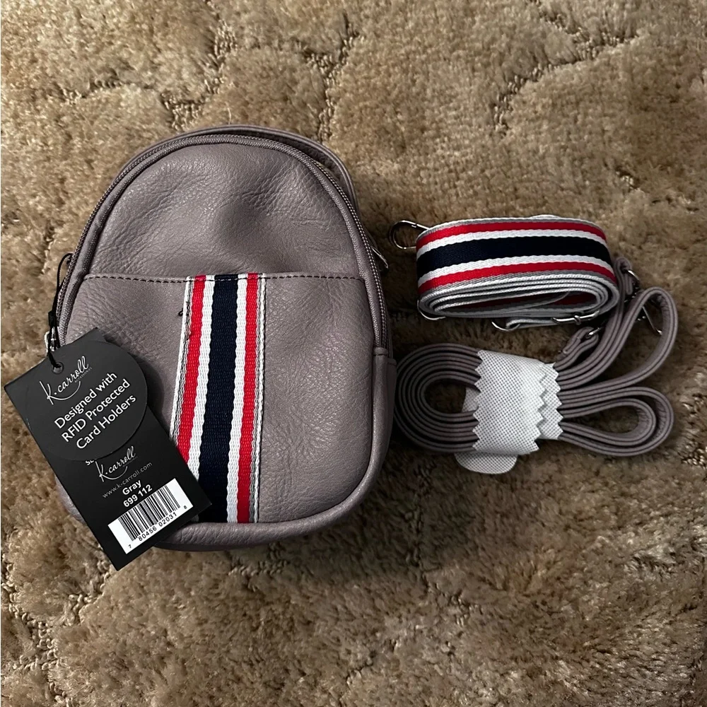 K.Carroll crossbody mini backpack with 2 adjustable straps. One is solid gray; the other is gray, white, red and navy striped. RFID lining. Great for travel!