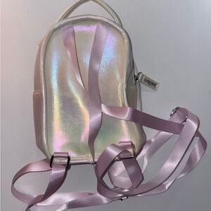 White holographic backpack with light pink silky straps (7in H x 5in W)