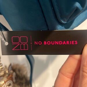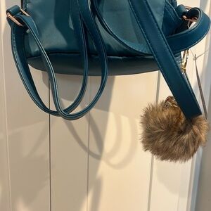 Chic blue mini backpack with a sparkly kitty fur keychain. Features a front pocket and adjustable straps. Perfect for everyday use.