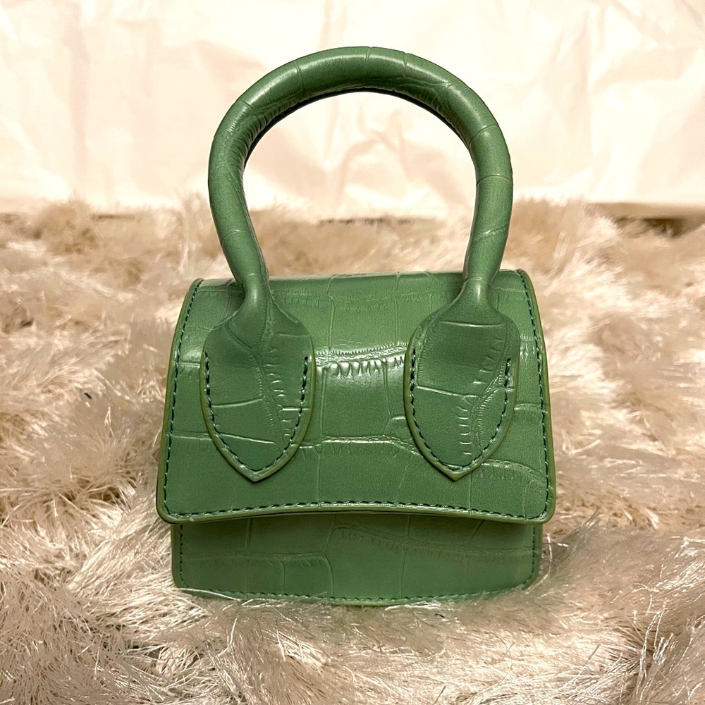 Mini handbag, appx 3 1/2 x 3 1/2 inches. Features an attachable shoulder strap.