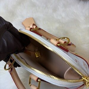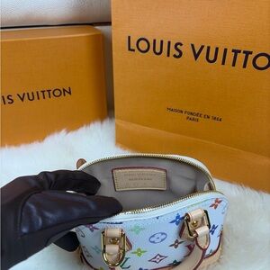 Chic mini bag with colorful monogram. Gold-tone hardware and cream details. Perfect for a stylish flair.