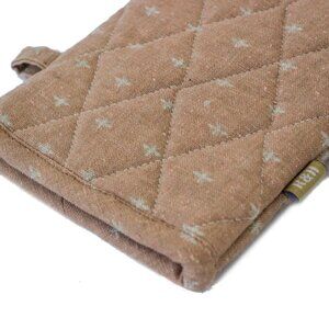 This set of one standard oven glove and one double oven glove will keep hands and arms safe while adding a touch of color and charm to your kitchen. Both are quilted to offer extra protection from the heat. The double oven glove offers extra protection to you forearms as well as hands. All made from 100% recycled cotton and natural dyes. This soft clay color is a warm lighter toned earthy neutral. Double oven glove 7"w x 35" L. Standard oven glove is 7" w x 13" L.
