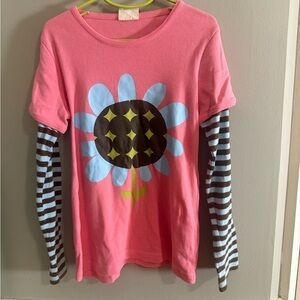 This charming pink kids shirt features a playful flower design and stylish striped sleeves. Perfect for adding a pop of color to any outfit.