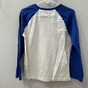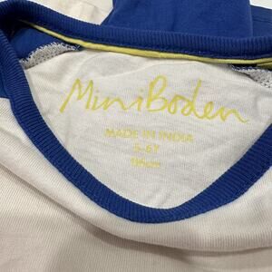 Mini Boden long sleeve shirt size 5-6. White with blue raglan sleeves featuring appliqué rainbow on front. Good condition for age and appliqué folding.