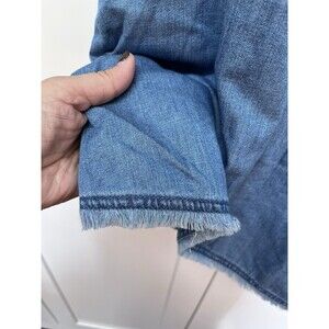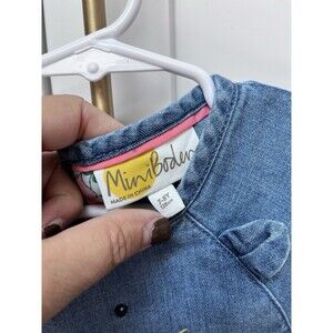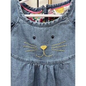 Mini Boden Blue Denim Kitty Cat Dress Girls Sz 7/8 Raw Hemline Embroidered Face