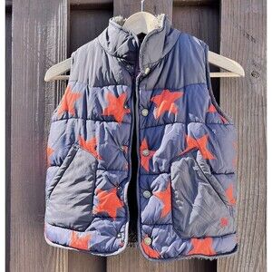 Mini Boden Boys Fleece-lined Puffer Vest Orange Stars SZ 5-6 Y Sleeveless Gray