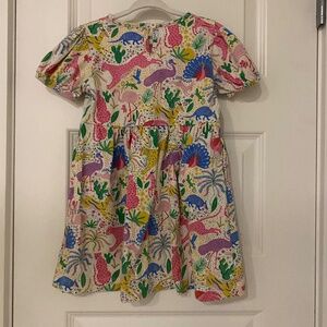 Mini Boden brand short sleeve dress featuring multicolored wild animals. Puffed sleeves. Animals include peacock, cheetah, flamingo, armadillo, and more. Colors are pink, yellow, blue, green on an off white background. From a pet and smoke free home that uses unscented detergent.