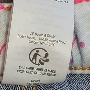 Mini Boden cropped jeans with embroidered flowers on the front. Stunning. Adjustable waist. 99% cotton and 1% elastane. Front and back pockets.