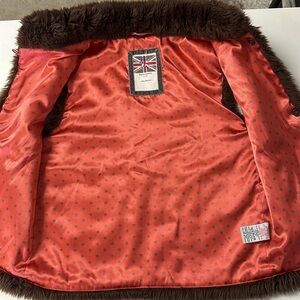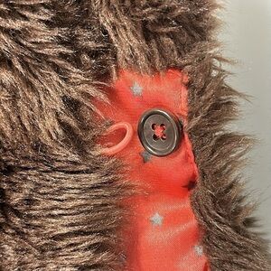 Lined with a satin type material and has a loop and button closure. Pockets on the front