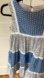 Dress features blue and yellow daisies with lace trim, back keyhole opening, fully lined, 3 tiered skirt