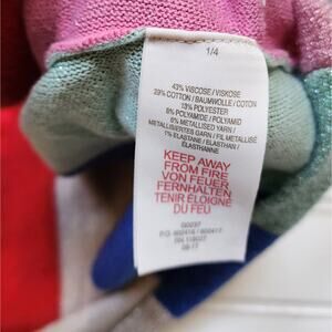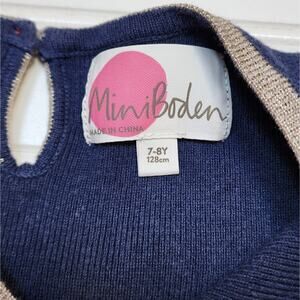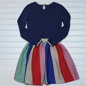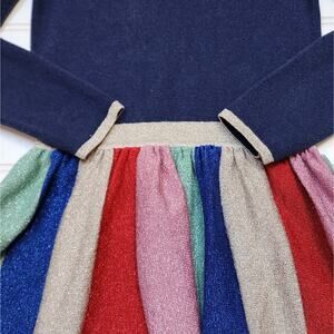 Mini Boden Girls Sparkle Party Knitted Dress, size 7-8Y, blue with sparkle gold, blue, green, red and pink skirt, button closure at back, very good condition.
