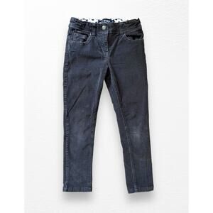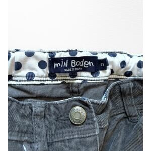 Gray corduroy jeans from Mini Boden in girls' size 8. Features 5 pocket design, inner adjustable waist, and button/zip closure. Good used condition: moderate fading on knees.