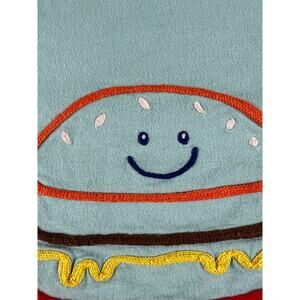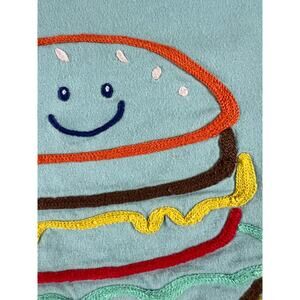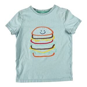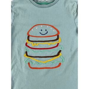 Blue Short sleeve tee with cheeseburger on front. Has pilling/wash wear/fading.
