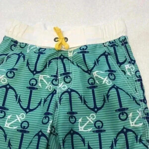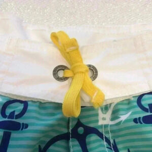 Mini Boden JohnnieB boys swim trunks. Velcro and tie close. Green and navy blue anchor design. White waistband with yellow accents. 18-1/2” long from waist. Inseam is 8”. Tsp open side pockets and one Velcro close back pocket.
