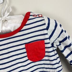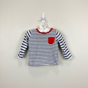 Mini Boden Long Sleeve Striped Pocket T-Shirt. Baby boy size 3-6 months. Long sleeve navy blue and white top with red pocket. Snaps on the shoulder for easy on/off. Great condition!