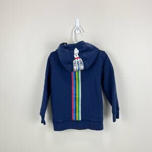 Mini Boden Navy Blue Rocket Ship Hoodie. Toddler boy size 4-5 years. Cozy full zip hooded sweatshirt with front pockets and fun space ship design on the hood, leaving a rainbow stripe down the back. Great condition with light wear.