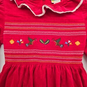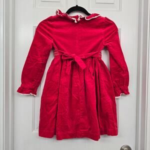 Capture the joy of the season with this adorable Mini Boden festive dress. Made from soft, luxurious red velvet, this long-sleeve dress features intricate smocking across the chest with embroidered reindeer, trees, and stars—perfect for holiday celebrations and family photos. Designed with ruffle trim at the collar and cuffs for a classic nostalgic look.