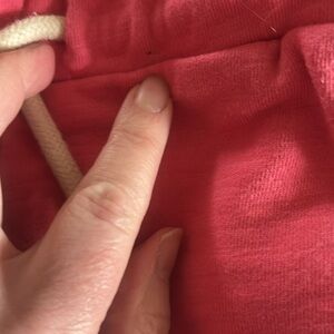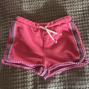 Salmon colored shorts with print along the edges