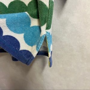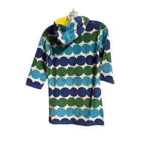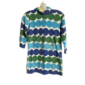 Good condition Mini Boden Terry cloth coverup. Blue and green circle print. Yellow accent. Hooded tunic with front kangaroo pocket.