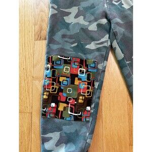 Mini Boden Upcycled Repaired Joggers Pants Green Camouflage Elastic Waist and Drawstring. Size 6Y.