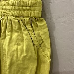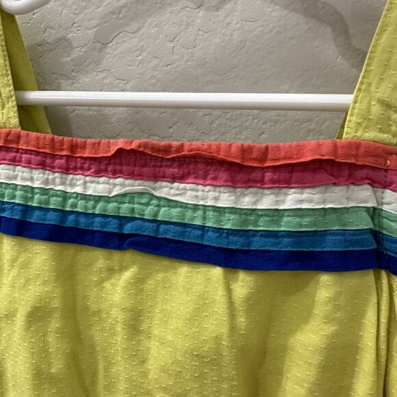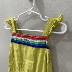 Mini Boden romper size 2-3. Yellow textured fabric with rainbow stripes across bodice. Flutter sleeves tank style with pockets. Super cute for summer! Play condition for some spots, but they aren't super noticeable.