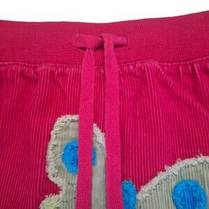Features: fully elasticated waistband, functional drawstring, intentional frayed edge butterfly/leaf appliqués on front and back