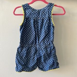Mini Boden polka dot chambray romper with yellow trim, size 2-3