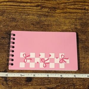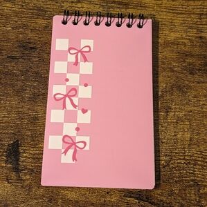 Light pink mini spiral notebook with pink checks and pink bow design.