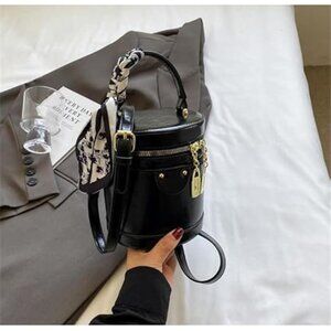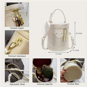 This structured cylinder purse maintains its crisp shape, measuring a convenient 5.5" (L) x 4.7" (W) x 6.3" (H) - the perfect small handbag for essentials like phone, cardholder, keys.