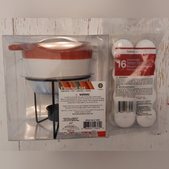 A fun fondue set. Includes 1 pot, 1 holder and 2 forks. Also includes a package of 16 tealight candles. Instructions are included.