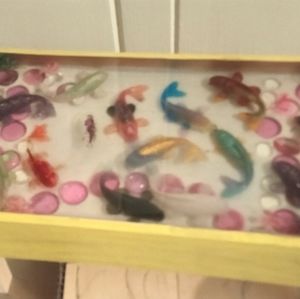 hand crafted mini Coaster Table with koi fish swimming about topped with a epoxy resin finish 11inches X 6inches