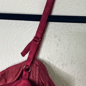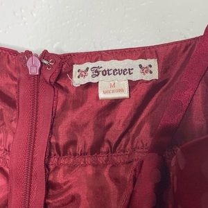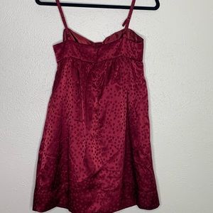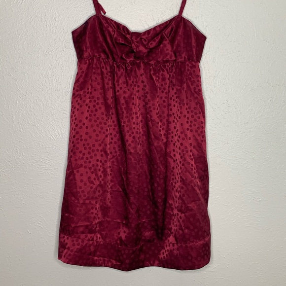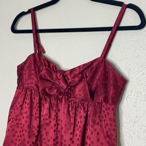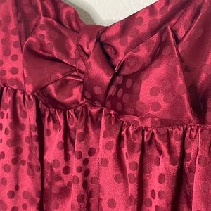 Maroon silky dress with bow detail. Monochromatic polka dots. Adorable!