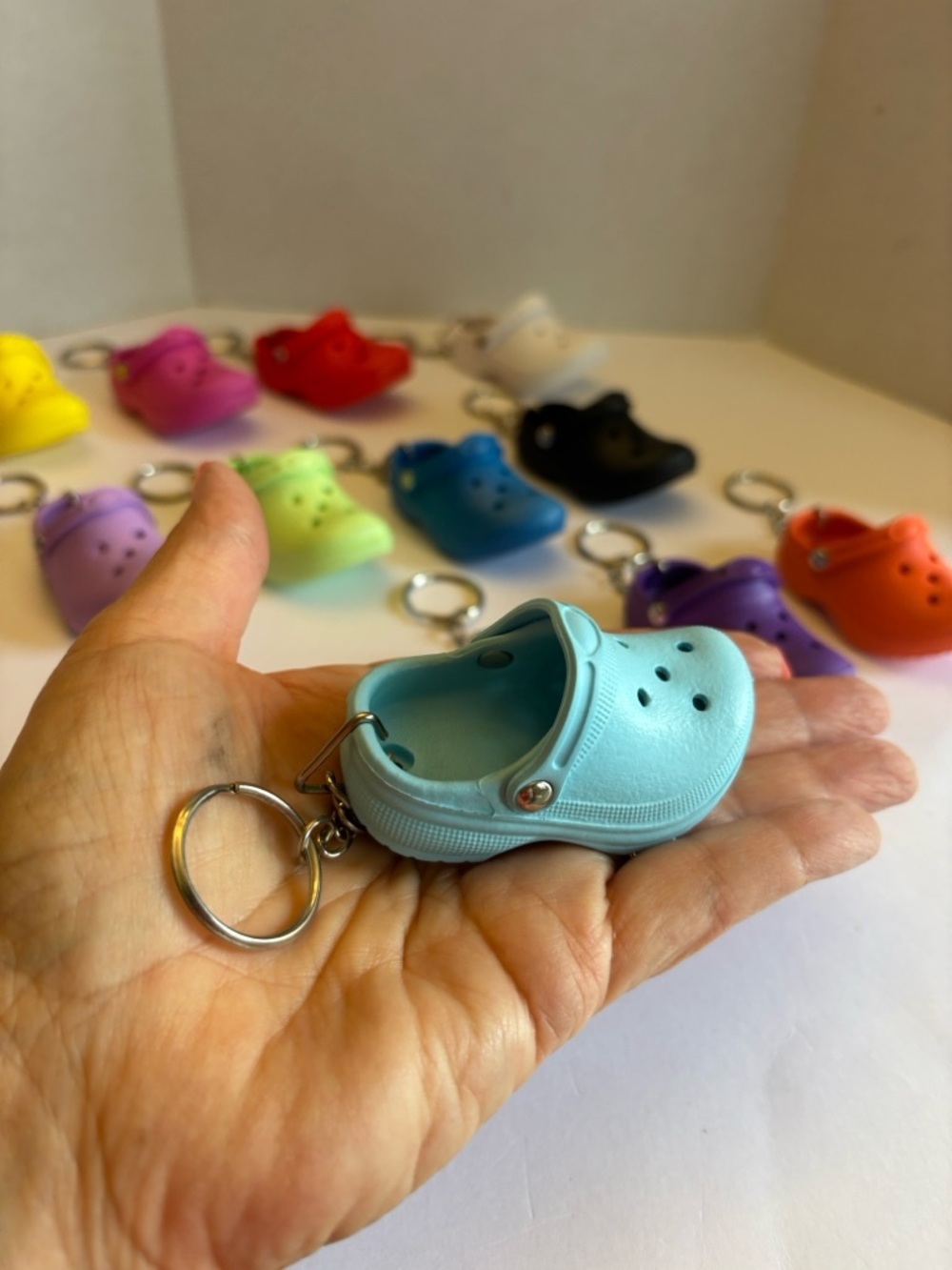 Mini croc keychain.Features a durable metal ring and realistic clog design. Lightweight and fun!