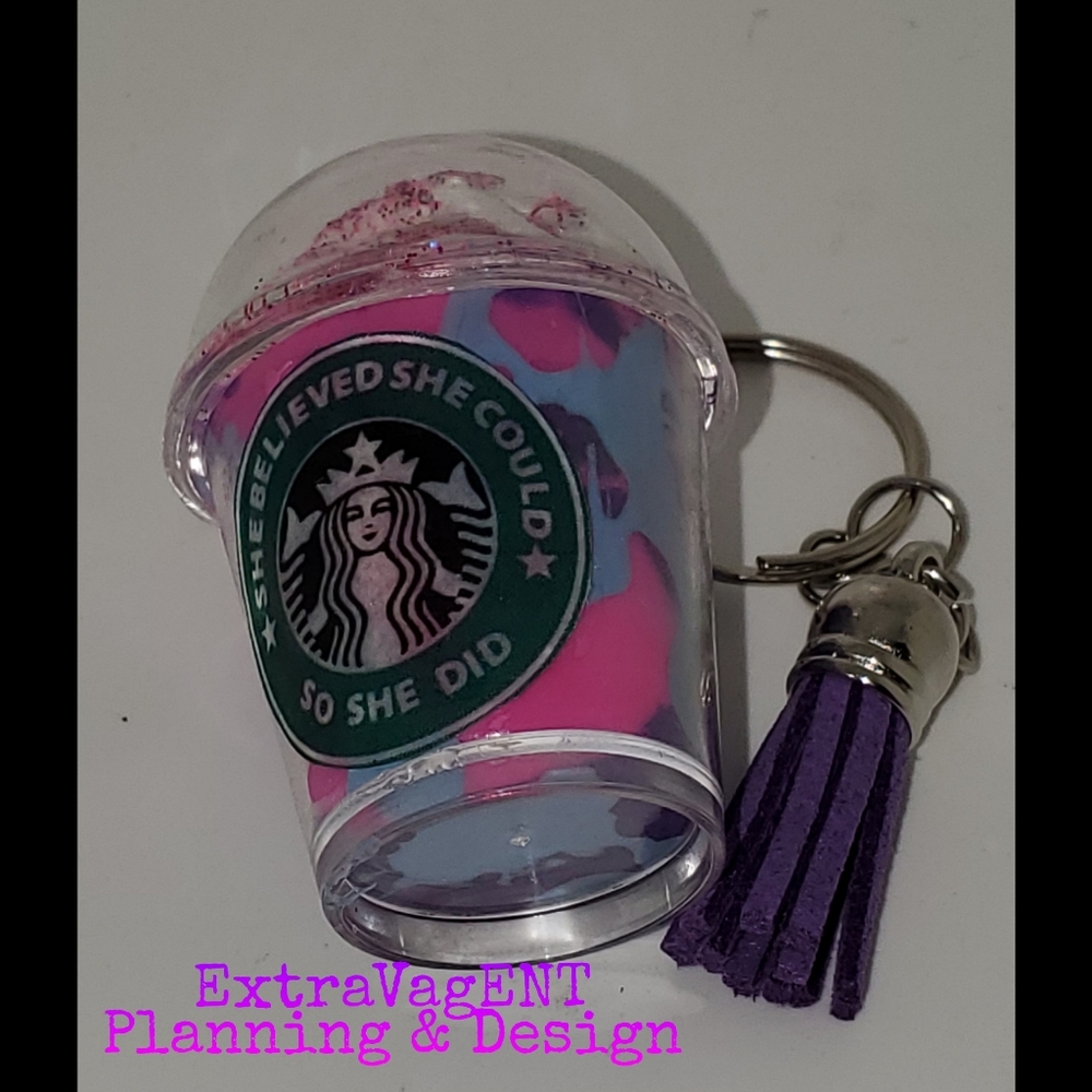 Mini Custom Keychains coffee, or drink keychains. They are approximately 5 inches tall & 2ozs