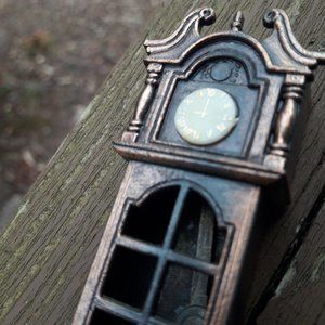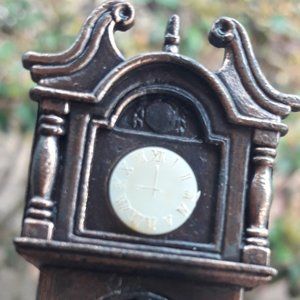 Mini Dollhouse Clock Cast Iron Pencil Sharpener Vintage tiny metal Grandfather Clock Metal Pencil Sharpener unique school supply item vintage curiosity. Clock with moving pendulum and tiny gold numbers on the face collectible dollhouse accessory or curio cabinet display item found in curio cabinet from 1979. Unique school supply item. Fully functional pencil sharpener on bottom and shavings should fall out of the back. Makers mark says made in Hong Kong.