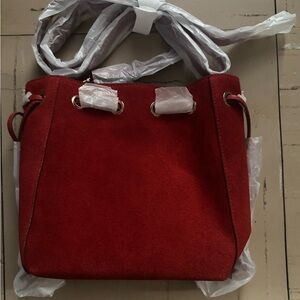 This mini suede bag features a drawstring detail that cinches closed, an adjustable crossbody strap and leather trim. Accented with decorative beads at the drawstring ends, it's perfectly sized to hold your phone, card case and lip gloss.