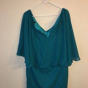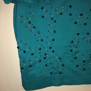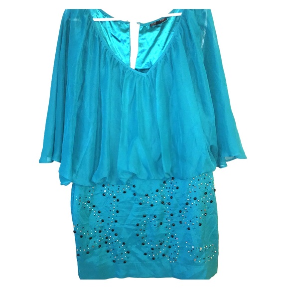 Teal color mini dress with amazing beaded design on the skirt. The top of the dress is a sleeveless tank with sheer teal bat sleeve v neck over lay attached. Missing button on the back of dress. Dress lightly worn good condition.