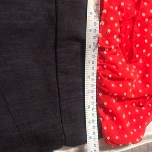 Tomato red top and dark denim bottom mini dress. Very cute belted.