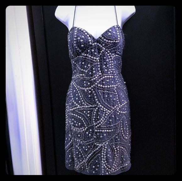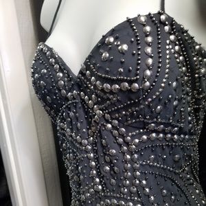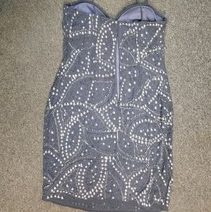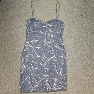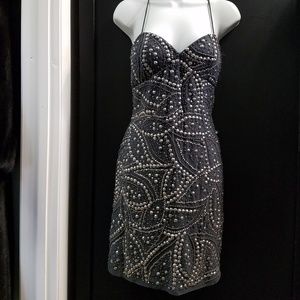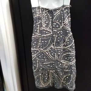 Mini- length, spaghetti strap, silver, beaded, lined, party dress, cocktail dress, evening dress
